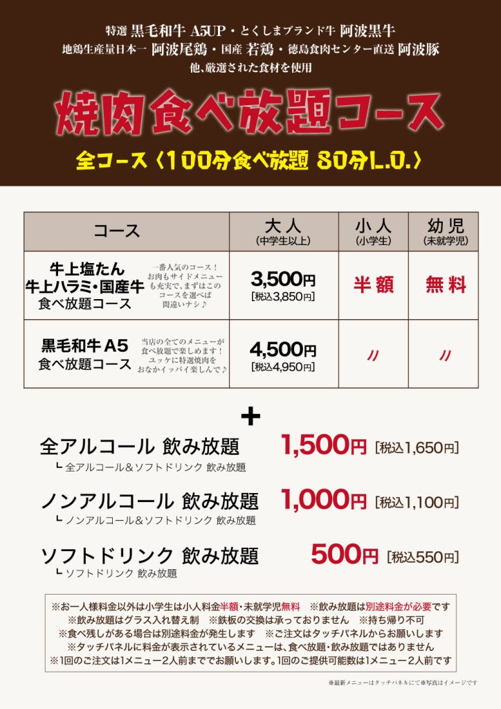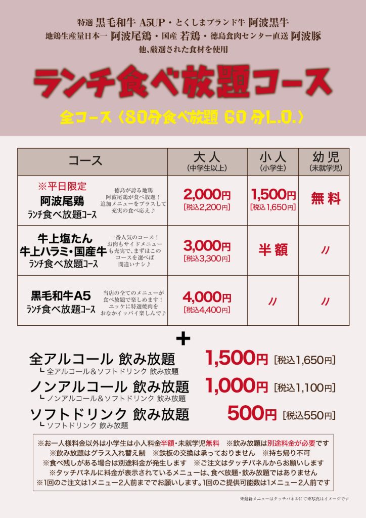 「牛上塩たん・牛上ハラミ・国産牛 ランチ食べ放題コース」 3,000円[税込3,300円]